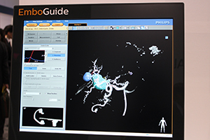 3月にリリースされた,血管撮影装置アプリケーション「OncoSuiteパッケージ」も初めて披露された。これは,肝動脈化学塞栓療法(TACE)などの塞栓療法において腫瘍の栄養血管候補を自動で抽出する「EmboGuide」と,3D穿刺ガイドソフトウエア「XperGuide」に術前のシミュレーションサポート機能を搭載した「XperGuide Ablation」からなるアプリケーションパッケージ。「Allura」シリーズに搭載可能で,すでに導入している施設へのアップグレードにも対応する。