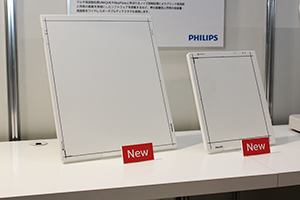 デジタルX線一般撮影装置では,4月10日より提供を開始している「DigitalDiagnost」の新バージョンに搭載可能なカセッテ型ワイヤレスFPD「SkyPlate」(オプション)を展示。提供されるFPDは,14インチ×17インチと10インチ×12インチの2サイズで,それぞれ2.8kg,1.6kgと軽量で,かつ堅牢なつくりとなっている。さらに,SkyPlateに搭載可能なノイズ抑制処理技術“SkyFlow”も紹介。現在は胸部領域のみの適応だが,グリッドレス撮影でもグリッドありと同等の高コントラスト画像を得られ,検査の効率化を図ることができる。