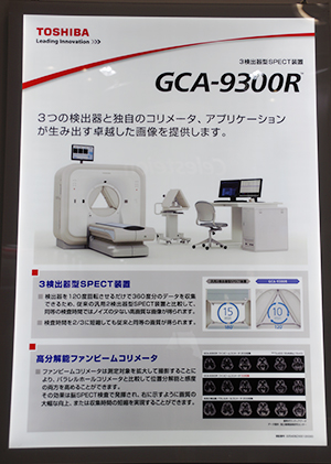 このほか,核医学装置としては,2013年9月に発表されたSPECT,GCA-9300Rがパネル展示された。3検出器型のSPECTで,2検出器型と比べて収集時間の短縮化が図れるほか,2検出器型と同じ撮像時間で高画質を得られる。通常のパラレルコリメータよりも高分解能,高感度であるファンビームコリメータをオプションで用意。ソフトウエアには,ガンマ線吸収の影響を改善する“SSPAC”などを搭載している。