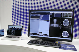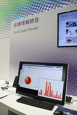 横河医療ソリューションズは,昨年から統一ブランドになったShadeQuestシリーズの各ラインナップを展示し,新機能を含めて製品の魅力をアピールした。今年のブースのデザインは,コーポレートカラーの青と黄色をグラデーションに使った明るいイメージで,フレンドリーかつオープンな展示を構成していた。同社では,NTT西日本グループと協業したクラウドサービス「ShadeQuest/Unlimited」を2013年から提供しているが,ブースでは実際にクラウド環境での画像やレポートの使用感を体験できる端末が用意されたほか,神戸大学医学部附属病院やNTT西日本東海病院などの導入事例なども紹介した。そのほか,レポート画面のモニタを縦置きにレイアウトしたPACS(ShadeQuest/DIAGとReport),放射線科での造影剤などの薬剤管理,本人確認機能など医療安全の機能を強化した「ShadeQuest/RIS」,医師や看護師,医学物理士など放射線治療に携わる職種別の機能を強化した「ShadeQuest/TheraRIS」,放射線関連情報だけでなく院内の診療情報の参照とデータの二次利用を支援する「ShadeQuest/Monolith」などが展示された。