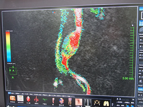 “4D Flow”(W.I.P.)は,初お披露目となった血流解析のソフトウェア。MRIの3D phase contrast法にて得られるデータを解析し,x軸,y軸,z軸方向の信号強度をベクトル化することで,血流の方向と速さの可視化を実現する。血流の方向が矢印で,流速がカラーマップで示され,血流がよどんでいるところ,乱流しているところを観察できる。現在,症例検討を重ねているところで研究レベルではあるが,腹部大動脈瘤や脳動脈瘤の評価,大動脈解離の予測に利用できる可能性があるという。また,先天性心奇形は症状がなければ手術を控えるが,4D Flowにより心血流を把握することで,手術が必要なタイミングを適切に判断できる可能性があると期待される。2015年中のリリースを目標に開発が進んでいる。