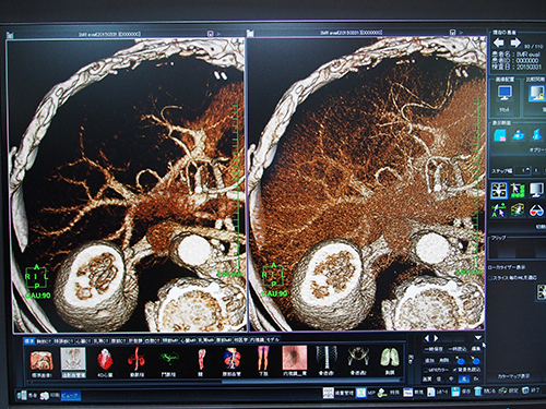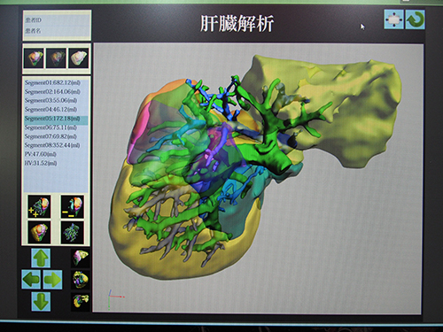 現在は肝臓解析ソフトウェアに対応しており,肝切除や肝移植の術前に解析したデータを3D PDFレポートで出力することで,カンファレンスや患者への説明に使用できる。また,カットラインを解析したデータを手術室でモニタやタブレットに表示して,手技の際に参照することもできる。肝実質や血管走行の3Dイメージを任意の方向から観察できるため,構造を把握しやすく,特に腹腔鏡下など視野の限られる手術では,切除を進めるに当たり次にどのような血管が現れるかを把握でき,安全・安心な手技を支援する。