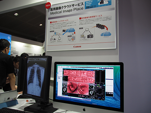 キヤノンブースのキヤノンMJのエリアでは,AZEがキヤノングループとなったことで実現した医用画像クラウドサービス「Medical Image Place」のコンテンツの一つである,「遠隔読影インフラサービス」が紹介された。Medical Image Placeは,キヤノンMJグループが運営するクラウドサービス基盤を活用し,高度なセキュリティ対策の下,日本国内のデータセンターにデータを多重保管できるクラウドサービス。ITEM2015直前の4月14日に,Medical Image Placeの新サービスとして「医用画像外部保管サービス」の提供も開始されたが,昨2014年10月に第一弾のサービスとして開始されたのが,遠隔読影インフラサービスである。