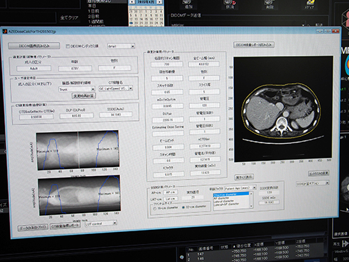 被ばく線量の管理には,一般的にCTDIvol,DLPが線量指標として用いられているが,これは成人の人体を模した直径32cm(腹部)と直径16cm(頭部)のファントムを使って正規化した指標であるため,特に小児の検査においては適切な線量管理ができないことが課題となっている。そこで近年提案されているのが新しい指標SSDEで,これは,被検者の実際の体輪郭から実効直径を求め,その実効直径から線量を評価することができる。開発中の線量管理支援ツールでは,DICOMデータを基に体輪郭を自動計測して実効直径を算出し,SSDEが自動計算されるため,簡便に線量管理に用いることができる。ユーザーはDICOM画像を読み込み,領域とCT機種名を選択するだけで,線量指標が自動で計算され,管電流マップも表示される。なお,国内で使用されているCT装置各機種のパラメータが搭載されている。
