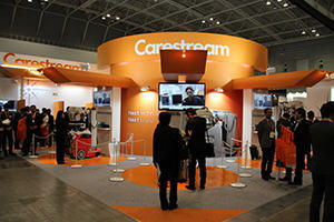 ケアストリームヘルスは,“Next Technology,Next to you”をテーマに,X線モダリティとヘルスケアITソリューションを中心に展示を行った。X線モダリティでは,アメリカのヘルスケア市場の調査会社であるMD Buyline社の第1四半期の顧客満足度調査で最高評価を獲得した,移動型X線診断装置の「DRX-Revolution Mobile X-Ray システム」,クリニック向けで省スペースの設置が可能な小型CR「Vita Flex CRシステム」などを展示。ヘルスケアITソリューションでは,自動認識や病変トラッキング機能などを搭載した「Vue PACS」,HTML5に対応したゼロ・フットプリント・ビューワの「Vue Motion」などを紹介した。