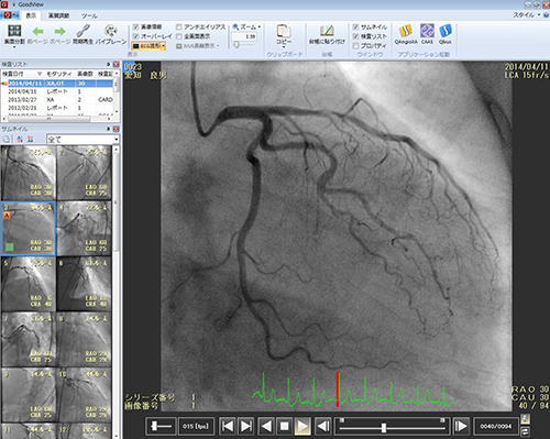 DICOMビューワ 「GoodView」は,アンギオ像の自動Biplane表示,IVUS像の長軸比較表示等,モダリティそれぞれの特性に応じた表示機能を搭載しており,Singleframe DICOMのCT,MR像の参照表示も含めてマルチにご活用いただけます。直感的な操作が可能なGUIや,検索画面に戻らずともビューワ上でその患者様に紐付く他検査の画像が参照できる機能など,快適な操作性を提供し,さらに専用端末用と専用端末以外で閲覧するためのWebビューワの操作性を統一させました。またアノテーションやフレーム編集処理を施した後に各種動画・静止画フォーマットへ変換する資料作成に欠かせない機能も搭載しています。「GoodView」はこれらネットワークシステム用ビューワの他に,Windows,iOS上で単独でお使いいただける製品もラインナップしています。