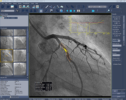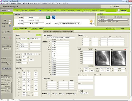 検査情報を管理する検査台帳(レポーティングシステム)は,関連する動画像との連携は勿論のこと,QCAやLVAなどの解析ソフトウェアの結果をレポートへ自動的に反映することが出来ます。心エコー画像に添付された検査結果やポリグラフの数値データも取り込み,手入力等によるデータの齟齬を防止するとともに,簡単にレポートを作成することができます。カスタマイズの要望にも対応しています。