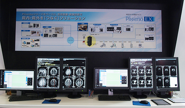 病院向けPACSとして展開しているPlissimo EXはスピーディな画像表示や検索機能などが特長のシステム。ITEM会場では「院内・院外を『つなぐ』ソリューション」として,施設内での運用や病診連携,病病連携といった地域医療連携におけるネットワークを紹介していた。遠隔画像診断では,連携先医療施設との間でシームレスな画像診断・参照環境を構築できる。例えば,連携先の医療施設の医師が在宅医療の場で,タブレットを用いて画像を参照するといったことも可能である。全国各地で進められている地域包括ケアにおいて,Plissimo EXを導入することで,画像診断・参照環境の充実化が図れると期待される。また,Plissimo EXは,クラウドサービスも提供しており,PACS内のデータのバックアップ保存などにも対応する。災害時に医用画像を消失するリスクを低減し,BCPの対策としても有用である。