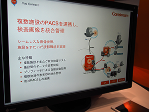 今年の展示では,ヘルスケアITソリューションの各製品と,病院の外来などで患者の画像情報をUSBメモリなどに書き込み,患者が自分で取得できるキオスク端末(My Vue Center Self-Service Kiosk)を紹介した。ヘルスケアITでは,PACSやVNAの機能を総称した「Vue archive」,読影ビューワの「Vue PACS Client」,レポートシステムの「Vue Reporting」,Webベースのゼロフットビューワ「Vue Motion」,クラウドサービスの「Vue Cloud Service」,日本向けに開発された「RIS-J」,紹介画像オンライン共有サービスの「My Vue Patient Portal」などを端末やデモンストレーションで紹介した。My Vue Patient Portalは,メールアドレスによるユーザー管理を行い画像データの参照を患者自身がインターネットを利用して行えるシステム。患者自身が画像のアクセス権限をコントロールでき,他の医師に画像のリンクを送ってセカンドオピニオンを得るというような運用も可能になる。