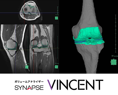 SYNAPSE VINCENTの新機能では,画像形状認識技術に磨きがかかりました。各臓器の解析精度や操作性が向上し,新たに搭載予定の「変形性膝関節症の診断・治療支援アプリケーション」では従来関節鏡での観察が必要であった膝軟骨の形状をMRI画像から的確に解析します。