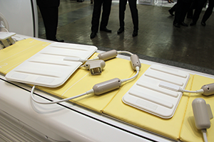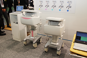 X線骨密度測定装置は,腰椎や大腿骨を測定できる骨密度測定装置「Dichroma Scan DCS-900FX」と,世界初展示となった新製品の「ALOKA ALPHYS A」の2機種を展示した。ALOKA ALPHYS Aは,これまで展開してきた前腕用X線骨密度測定装置「DCS-600」シリーズの後継となる新ブランドの装置で,健診施設やクリニックをメインターゲットとしている。従来機では1種類のスキャンモード(15秒)のみであったが,健診施設でのスループット向上に寄与する高速モード(7.5秒)と,より精度の高い検査を行える高精度モード(30秒)の3つの測定モードを標準搭載した。高齢化により増加する車椅子の被検者へ配慮し,台車を91〜104cmに上下動できるようにしたことで,車椅子のタイヤが台車に当たらないように調整可能となっている(オプション)。また,検査室の色調に合わせられるよう5色のカラーシートが用意されている(オプション)。6月からの販売を予定している。