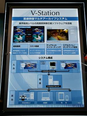 このほか,ブース内では施設内で行われている手術映像を記録するV-Stationのデモンストレーションが行われた。V-Stationは,一般的な圧縮技術の数倍の圧縮効率とされる独自の高画質映像圧縮技術により,手術室の術野カメラ,生体情報モニター,内視鏡,超音波診断装置の映像をリアルタイムでサーバ「V-Server」に保管する。保管された映像はネットワークに負荷をかけることなく,リアルタイムで配信することが可能。施設内だけでなく,ほかの医療機関や学会会場などへも配信できる。デュアルチャンネルエンコーディングに対応しており,術野カメラと生体情報モニターの画像を同期しながら記録するといったことも行える。