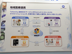 一方,診療所向けサービスであるinfomityは,コンソール・ビューワ・画像ファイリングの一体型システム「Unitea」のデータをリアルタイムでバックアップする「データバンクサービス」,患者紹介や検査依頼・結果,読影依頼・レポートなど,診療所と病院間の連携をサポートする「連携BOXサービス」,外出先から画像を参照できる「連携BOXモバイルサービス」など,豊富なサービスがある。「骨密度測定サービス」や経時差分処理,Bone Suppression処理といった,医師の診断を支援する機能も充実。ブース内では,連携BOXサービスとデータ出入力システム「ID-680HM」を用いた検診ソリューションなどを紹介していた。