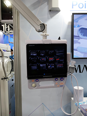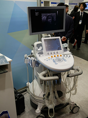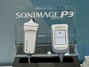 超音波診断装置のコーナーでは,ポケットタイプの「SONIMAGE P3」も展示された。本体(ディスプレイユニット)は縦11.5cm,横6.8cmで,重量は392g。救急医療や在宅医療などでも使用しやすいサイズが特長である。