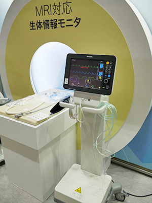 周辺機器としては,フィリップス社製のMRI対応生体情報モニタリングシステム「Expression MR200」が展示された。3T MRIに対応しており,ガウス制限は1500ガウス。SpO2,ECG,血圧が測定でき,オプションでEtCO2も可能となる。タッチパネルを採用しており,直感的な操作が行える。