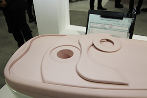 乳房専用PET装置「Elmammo」は現行装置の実機や臨床データを展示するとともに,新製品(薬機法未承認,W.I.P.)を模型で紹介した。新製品では,乳房を入れる検出器ホール部のマットの厚さを改良することで,撮像範囲を広げてブラインドエリアを小さくした。また,顔をのせるマット部の段差を下げ,くぼみを深くすることで,検査中の頸部の負担を軽減し,被検者がより楽に検査を受けられるようにしている。
