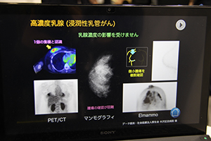 Elmammoは国内では9施設で稼働しており,臨床データも増えてきた。ブースでは,化学療法前後や放射線治療の効果判定など,さまざまな症例の画像を来場者に供覧した。化学療法では,がんの種類によって治療薬が異なることから,投与開始後できるだけ早期に効果判定を行い,治療薬を変更するか判断する必要がある。化学療法により全身用PETでは腫瘍が消失しているように見える症例でも,全身用PETと比べて圧倒的に感度・解像度が高いElmammoでは,わずかな残存を確認できるといった臨床的メリットが紹介された。