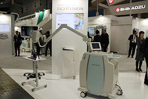 新分野の術中支援システム「LIGHTVISION」はITEM2016で発表したシステムだが,前回と比べ説明を聞く来場者が増え,関心の高まりがうかがえた。LIGHTVISIONは,薬剤インドシアニングリーン(ICG)を血管やリンパ管に投与し,近赤外励起光により励起されたICGの近赤外蛍光を画像化するシステムである。通常の視野画像に重ねてモニタ表示することで,血管やリンパ管を容易に確認することができる。ICGは現在,乳がんセンチネルリンパ節切除の手技において保険適用となっている。LIGHTVISIONは,ICGの近赤外蛍光を白色だけでなく緑色にすることもでき,ハイビジョンモニタ搭載により高精細な映像で観察できるといった特徴を有する。また,モニタには,ICGの近赤外蛍光の画像,通常の視野画像,2つの重ね合わせ画像の3画像を同時に表示でき,大きな枠に表示する画像を必要に応じて切り替えることができる。