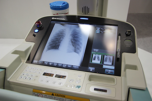 血管撮影システムは,FPDを搭載したTrinias MiXシリーズの床置き式「F12」システムの実機を展示した。Trinias MiXシリーズは,被ばくと造影剤量の低減,検査時間の短縮により,低侵襲な検査・治療を支援することをコンセプトに開発されたシステムで,今回は,新開発の技術・ソフトウエアを中心に展示した。