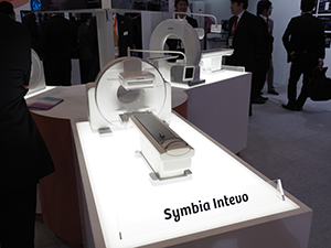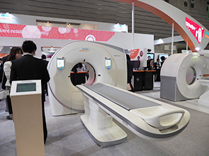 この戦略に基づき,ITEMに合わせて多くの新製品発表や,サービスの拡充が行われた。ブース内には,普及価格帯の新製品として,タブレットからほとんどの操作が可能なCT「SOMATOM go」,ハイエンドクラス装置のアプリケーションを搭載しつつ,コストパフォーマンスに優れた1.5T MRI「MAGNETOM Sempra」が展示された。また,前回のITEMで発表された検査データの可視化で放射線部門の業務効率を向上するクラウドサービス「teamplay」も新機能が紹介された。このほかにも,新製品としてハイブリッド手術室向けに開発され,2017年3月に発表されたばかりの血管撮影装置「ARTIS pheno」やハイエンドクラスのDSCT「SOMATOM Drive」,オープンボアX線CT装置「SOMATOM Confidence RT Pro」もPRされた。さらに,女性医療や循環器系疾患における検査,診断,治療といったトータルソリューションを紹介するコーナーを設けられた。