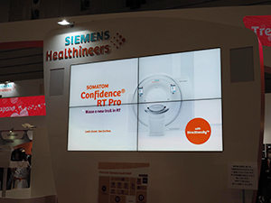 ITEM初日14日に発表されたSOMATOM Confidence RT Proは,会場内の液晶ディスプレイで説明が行われた。治療計画用CTとして,新しい画像再構成技術“DirectDensity”を搭載。治療計画を作成する上で重要となる線量分布計算において,従来は同一の管電圧を用いて撮影しそのCT値を電子密度に変換していたが,DirectDensityでは撮影条件によらず一定の電子密度へ変換できるため,被検者の体格や部位など条件を変更して撮影を行える。また,金属アーチファクトを低減する“iMAR”を搭載しているほか,dual energy撮影も可能である。