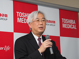 東芝メディカルシステムズは,2016年末にキヤノングループ入りが正式に決定し,新社名も“キヤノンメディカルシステムズ”となることも発表した。したがって,今回が“東芝メディカルシステムズ”の社名としては最後のITEM出展となる。ブースでは従来の東芝メディカルシステムズとキヤノンのロゴを並べて掲示し,キヤノングループの一員となったことを改めてアピールした。展示初日に開催された高精細CT「Aquilion Precision」の記者発表会で挨拶した瀧口登志夫社長は,ここまでの経緯を振り返りながらこれからの展望について,「東芝メディカルシステムズの名前では最後のITEMとなるが,移行の年として実りあるものにすべく社員一丸となって取り組んできた。今後、キヤノングループの力を結集して高齢化に伴うさまざまな課題の解決に取り組んでいきたい。」とコメントした。