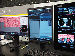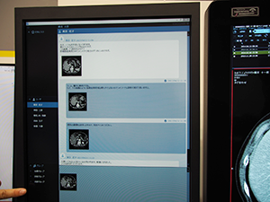 展示内容も“つながる”というテーマに沿って,システム間の連携の強化と,人をつなぐための新たなツールの提案がトピックとなった。システム間の連携としては,PACSでのザイオソフト社の3Dワークステーション「Ziostation2」との連携が強化されたことを紹介した。サーバ上でPACSのデータを共有することで3D画像の作成や表示のスピードを向上している。そのほか,横河医療ソリューションズのシステム間(レポートシステムと治療画像ビューワのViewRTなど)の連携もより深く密に連携するように機能を向上させている。さらに,電子カルテシステムともシステム開発で提携する富士通を初めとする各ベンダーとの連携強化を進めていることが紹介された。