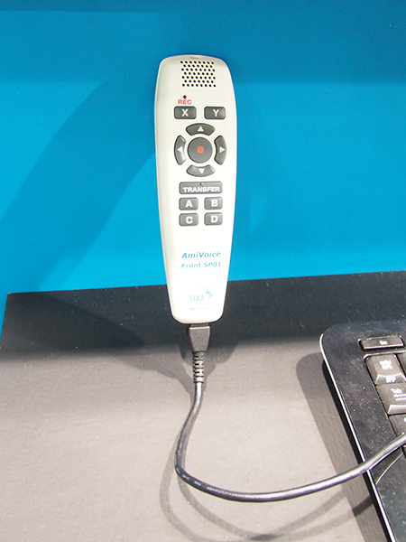 同社では,インプットデバイスとしてさまざまなタイプの音声入力マイクなどを用意しているが,今回自社製マイクのAmiVoice Front SP01も展示された。