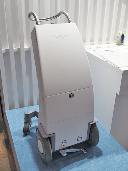 治療装置の新製品として,密封小線源治療装置「フレキシトロンHDR」が展示された。直径0.86mmのIr-192線源を使用し,腫瘍近傍に線源を移送することによって局所的な治療が可能となる。従来の「マイクロセレクトロンHDRシリーズ」よりも線源が細くなったほか,チャンネル数が最大30チャンネルから40チャンネルへと増えたことで,より広範囲の治療が可能となった。デザインも一新されており,線源の格納位置が変更されたことで重心が下がり,装置の安定性が向上している。