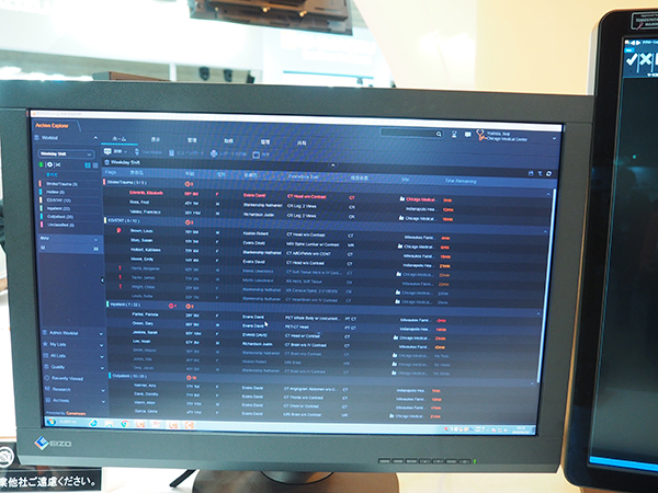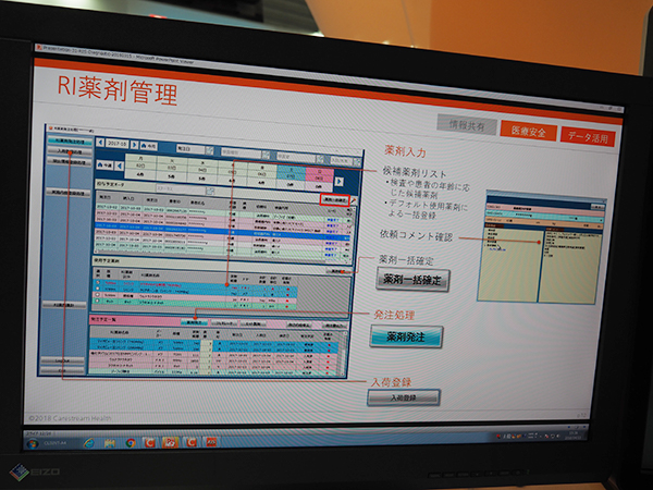 ワークフローマネジメントの核となるRISでは,放射線情報システムとして診断と治療,それぞれの業務に対応する「CARESTREAM RIS-J」を中心に展示。RIS-J(診断RIS)では,さまざまな情報を1画面に集約して表示して効率的な情報共有を図っていることや,プレチェック(医師からの検査指示)の入力などの機能を紹介した。プレチェック機能は,ニーズが高いことからRISから独立して,別のアプリケーションとしても用意されている。また,医療機関によってさまざまなワークフローがあるRIの薬剤管理についても柔軟に対応できることをアピールした。