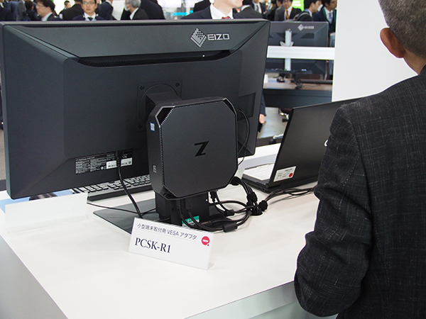 EIZOは今回,独自開発のアダプタを用いることで,モニターとHP社のミニワークステーションを組み合わせて省スペース化を図る提案を行った。ブースでは,8メガピクセル電子カルテ画像表示モニター「RadiForce MX315W」の背面に,新製品の小型端末取付用VESAアダプタ「PCSK-R1」で「HP Z2 Mini G3 Workstation」を取り付けたセット商品を紹介。正常な映像表示・動作と取り付けた状態での転倒安全性については互換性検証ずみで,省スペースかつパワフルなデスクトップ環境を提供する。