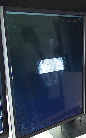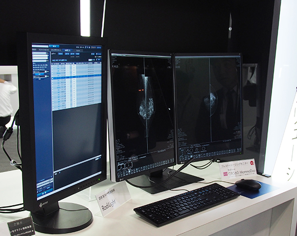 ブース中央に,新製品のRadiForce GX560 MammoDuoを展示した。5メガピクセルモノクロモニター「RadiForce GX560」2面を専用スタンドで一体化させ,マンモグラフィや乳房トモシンセシス画像の比較読影を可能にした。画質面の追究だけでなく,作業効率向上のため,“Work-and-Flow”機能のうち“Point-and-Focus”機能と“Switch-and-Go”機能を搭載している。Point-and-Focus機能はマウスとホットキー操作により,表示している医用画像の関心領域のみをフォーカスし,輝度・階調を調整することで読影に集中しやすくなる。Switch-and-Go機能は,別々のシステム(例えば,読影用と電子カルテ用端末)でそれぞれ必要だったモニター・キーボード・マウスを切り替え機能により1組みに集約できる。マウスのカーソルを画面の所定の位置に移動させるだけで,使用したい端末の操作に瞬時に切り替えることができ,作業効率が向上する。さらに,低温ポリシリコン液晶パネルの採用により,2500cd/m2に高輝度化。キャリブレーション推奨輝度 最大1000cd/m2の維持を5年間保証する。また,コントラスト比1700:1で白浮きを抑えた明瞭な黒色での表現が可能である。モニターには,読影室向け間接照明「RadiLight」も取り付け,併せて紹介した。