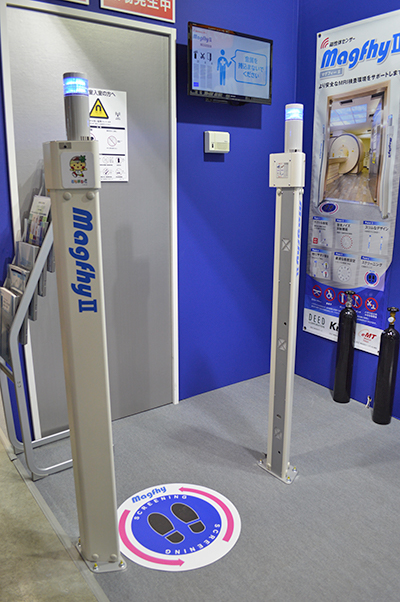 New magfhy IIは,MRIの吸着事故を防止するための磁性体センサー。MRI検査室の入室前にMRIへ吸着する可能性のある磁性体だけを高性能に検知する。外寸1557mm(高さ)×120(幅)×210mm(奥行き)というスリムデザインの2本柱で構成。柱の間隔は内寸で1550mmまでの幅で設置でき,MRI検査室入口に省スペースで設置が可能となっている。