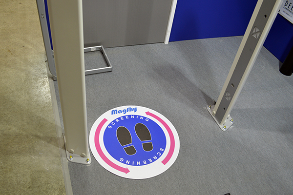 New magfhy IIの特徴の一つである“ベクトル検知”機能はこのたび,特許を取得した。磁性体の移動する方向や大きさを演算して磁性体を検知することができる。重篤な吸着事故につながる点滴スタンドなどの検知に加え,軽微な小物金属をも逃さずに検知する2チャンネルの設定回路とスクリーニングマットが追加された。2チャンネルの通過磁性体感度スイッチは柱に内蔵され,それぞれ10段階で調整できるロータリースイッチで,管理責任者などの施設スタッフが環境や運用状況に応じて容易に変更することが可能である。柱にチャンネル調整の早見表シールを貼り付けることで,調整するたびにマニュアルなどを探すというような煩わしさを軽減。また,スクリーニングマットは,2本柱の間のどちらか一方の柱近くに設置する。マットの上に立ち,マットに描かれた矢印に従って1回転することで,より軽微な磁性体金属を検知する。被検者だけではなく,忙しいために医療スタッフでも,つい外すのを忘れてしまいがちなスマートフォンやロッカーなどの小さな鍵,はさみ,カッターといった磁性体金属を逃さず検知する。
