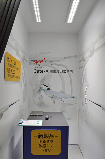新発売となったCate-X(カテックス)は,mag luminanceシリーズの循環器X線検査室に対応した高輝度LED照明である。生体モニタなどのME機器に影響のない低ノイズ電源で,演色評価数Ra90の高演色の素子を採用している。集光用特殊レンズにより高照度を実現。ITEM会場の展示では,天井高さ3m,2器具配列した場合の検査室環境を体感でき,寝台の高さでの照度は1万7000luxを超えていた。