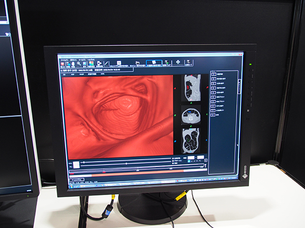 FORZのPACS機能として,「Line-View」を紹介。時系列サムネイル表示ができるLine-View画面と画像表示ビューワを並べて,必要な画像をグラフィカルに表示できる。3Dビューワを強化したほか,仮想内視鏡画像の表示が可能となっている。