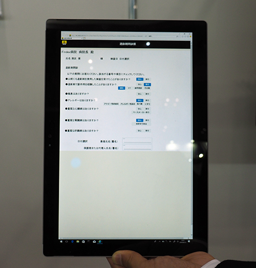 新たな機能として,RIS「ProRad RIS」と連携させて利用できる問診票機能を紹介した。これは,造影検査などの前に行う問診において従来の紙ではなくiPadを用いることで,そのままRISに情報を取り込むことを可能にしている。これにより,RISでの入力作業を省力化,時間短縮が図れるほか,医療安全の観点からも入力ミスの防止が可能になる。また,ProRad RISの最新バージョンでは,内視鏡や生理検査部門の検査業務にも対応し,一元的に情報を管理できるようになった。ProRad RISのモニタ画面上から放射線部門の検査画像だけでなく,内視鏡や超音波画像の表示も行える。