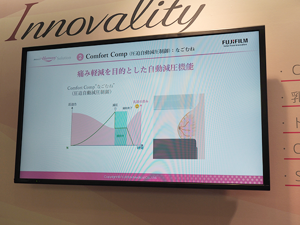 マンモグラフィでは,デジタル式乳房用X線診断装置「AMULET Innovality」向けの新たなオプション機能として“Comfort Comp(圧迫自動減圧制御):なごむね”“乳腺量測定機能”“トモシンセシス撮影用固定フェースガード”“CEDM機能”“S-view+”などを中心に展示を構成した。なごむねは,“ヒステリシス現象”によって同じ圧迫力でも1回圧迫したあとの減圧時の方が乳房の厚みが薄くなる特性を生かし,最大圧力時間を短縮する仕組みだ。特別な手順や機構は必要なくボタン操作で適応できるため,従来の撮影のワークフローを変えることなく,患者の負担を軽減できるのがメリットだ。
