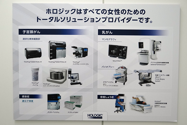 また,新しいトピックとして,2018年3月にホロジックとフィリップスがグローバルパートナーシップの締結を合意したことを紹介した。この合意により,フィリップスは,Women’s Health領域の提案においてホロジックの製品を提供することができる。このほかブースでは,Women’s Healthのトータルサポートカンパニーとして,ブレストケア以外にも,子宮頸がんをターゲットとした液状化検体細胞診ソリューションや,感染症の遺伝子検査製品,乳がんや子宮頸がんの化学療法により合併しやすい骨祖鬆症検査のためのX線骨密度測定装置など,他領域の製品を開発・提供していることをパネルで紹介した。