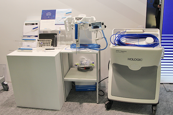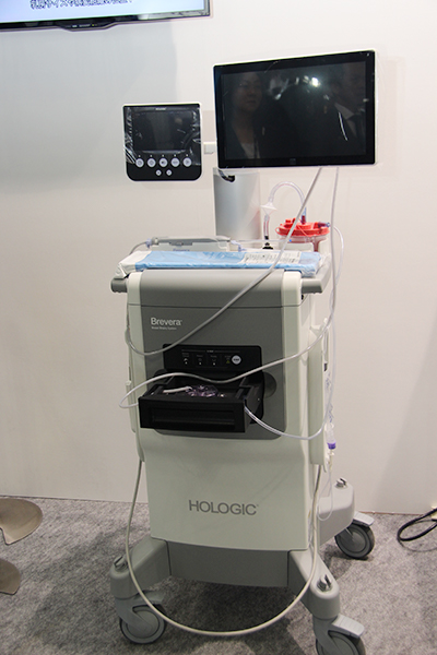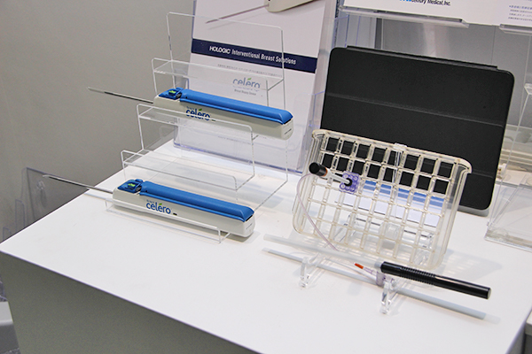 ブースでは,全世界で5000台以上導入されている主力製品のデジタルマンモグラフィ「Selenia Dimensions」,バイオプシーガイダンスシステム「Affirm」も展示。バイオプシーシステムは現行システムである吸引式組織生検システム「ATEC」と吸引式組織生検針セット「Eviva」に加え,検体採取から標本撮影までをひとつのシステムで完結する新しいバイオプシーシステム(薬機法未承認)を参考展示した。