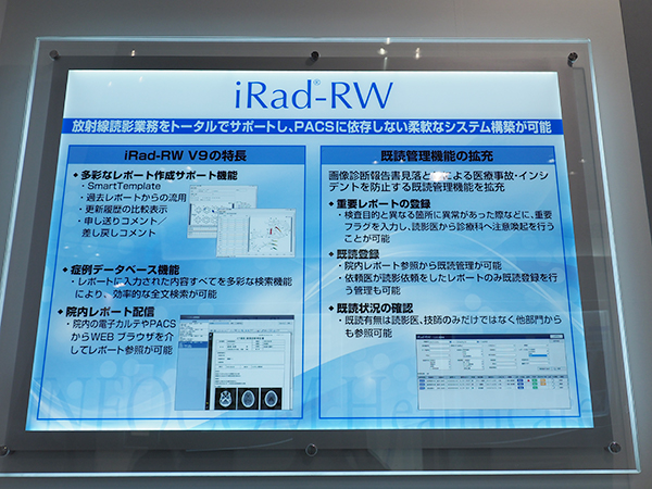 iRad-RTは,新バージョン「V9」へと進化。そのコンセプトや新しい機能が紹介された。また,RT Image Viewerも,地域連携での利用を意識した機能が強化されている。一方,iRad-RSも今回の診療報酬改定で新設された画像診断管理加算3の施設基準を踏まえた新機能についてアナウンスが行われたほか,iRad-RWでも読影レポートの見落としを防ぐための機能の追加されたことがPRされた。