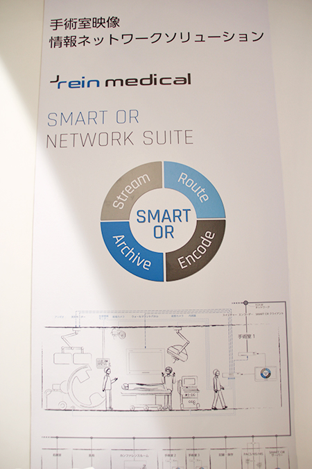 ブースでは,Rein Medical社の手術室映像・情報ネットワークソリューション「SMART OR ソリューション」を紹介した。SMART OR ソリューションは,手術室における画像や生体モニターの情報を一元的に管理するだけでなく,電子カルテやPACSなど病院情報システムとの連携や,手術室の映像の院内配信などを,手術室内部の管理用モニターで一括管理できる。