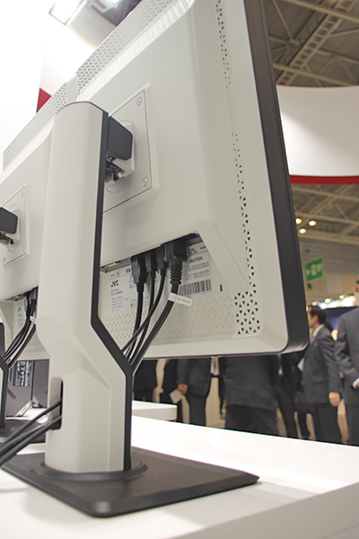 主力製品である医用画像表示モニターの新製品として2メガピクセルの「CL-S200」と3メガピクセルの「CL-S300」を展示した。両製品は,「TOTOKU」から「JVC」へとブランドを統一してから初めてとなる画像診断モニター新製品ライン「i3シリーズ」のモニター。従来製品の「i2シリーズ」からデザインが一新され薄型になり,ベゼルと画面との段差を極力少なくすることで1枚のフィルムを見ているように読影することができる。また,スタンドも含めた背面の色を白くすることで,モダリティや室内との調和をとっている。スタンドには大型のワイヤホールが採用され,ケーブルを容易にまとめることができる。2面構成の場合にモニタ同士をケーブルで接続できる“デイジーチェーン”により,ケーブル接続がシンプルになる。これらにより,省スペースかつすっきりとしたワイヤマネジメントが可能になる。