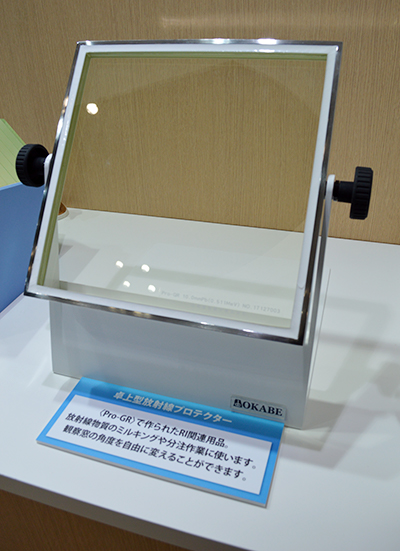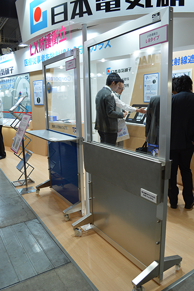 日本電気硝子は,業界トップシェアを誇るカバーガラス付き放射線遮蔽用ガラス「LXプレミアム」や「LX防護衝立」などを紹介した。放射線遮蔽用ガラスの展示では,LXプレミアムの有用性について使用例を挙げて紹介。臨床現場の要求に応える高いクオリティと安全性を両立して築き上げてきた信頼と実績をPRした。また,LX防護衝立は,衝立専用棚の試作品として固定式と折りたたみ式の2種類,「卓上放射線プロテクター」を展示した。