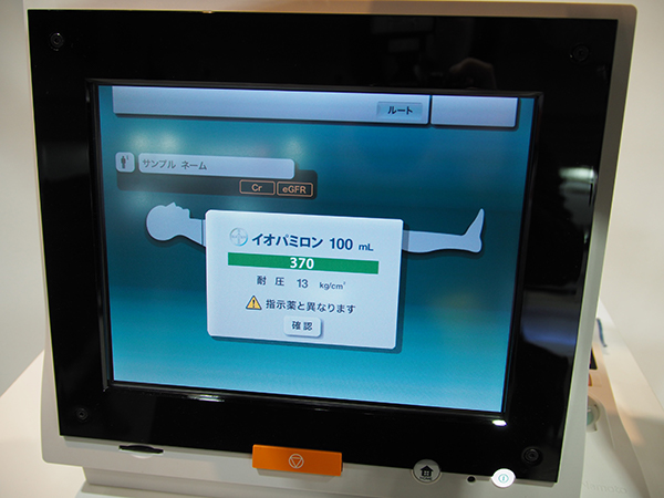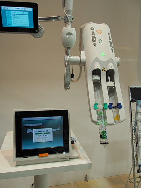 CT用造影剤自動注入器「DUAL SHOT GX7」では,今回,2つのソフトウエアが中心に紹介された。“LDIモード”は造影剤の希釈プロトコールで,低管電圧撮影やdual energy撮影に対応する造影剤濃度を自動で設定することができる。また,CEエビデンスシステムに搭載された指示薬連携機能では,ICタグを用いることで,指示薬ではない造影剤をインジェクタにセットするとモニタにアラートが表示されるようになった。