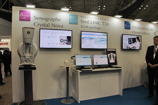 ブース内にはクリニック向け製品を集めたエリアが設置され,コンパクトで使い勝手に優れるX線テレビシステム「FLEXAVISION HB eXceed edition」や総合型電子カルテシステム「SimCLINIC T3α XLink package」を展示。また,新製品のスクリーニング用デジタルマンモグラフィシステム「Senographe Crystal Nova」(GE社製)は,世界最小クラスのマンモグラフィで,簡単な操作で低被ばく画像を提供する。