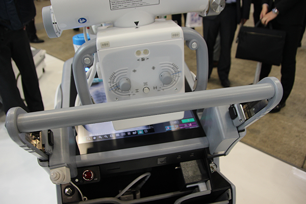 全世界3500台以上の実績を持つ回診用X線撮影装置MobileDaRtに,第8世代のMobileDaRt Evolution MX8 Versionが登場した。卵のような“丸い”印象を与えるデザインで,第7世代の「MX7」から雰囲気が一新。展示のキーワードでもある働き方改革を意識し,撮影業務を行う診療放射線技師が少しでも楽に扱えることをコンセプトに開発された装置である。まず,病棟内を安全に移動しやすくするため,X線管球の支柱を伸縮構造とし,走行時には1.27mの高さにすることで前方視野を確保した。本体幅も56cmに狭小化することで,装置の前方車輪のあたりも視認しやすくなっている。回診業務で,ベッドの間やエレベーターなど狭い場所に入る際の取り回しに威力を発揮するモーターアシスト駆動もMX7より向上させた。これにより,本体の操作もさらにスムーズに行える。走行時には,操作者の身長に合わせてハンドルの高さを調整できるオプションも準備し,楽な姿勢で安全な走行をサポートする。また,X線管球ハンドルの上下2か所にロックボタンを設けたほか,コリメータ操作ダイヤルも管球の前面・後面につけたことで,撮影時の操作性も向上している。