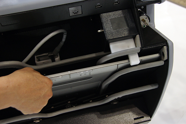 本体には,19インチモニタを搭載。MX7の17インチから拡大したことで撮影後の画像確認をしやすくなり,フルフラットのため清掃も容易だ。このほか,収納ポケットに入れたFPDの盗難紛失を防ぐロック機能や,小物の収納スペースなど,効率的に回診業務を行うための細やかな工夫が施されている。