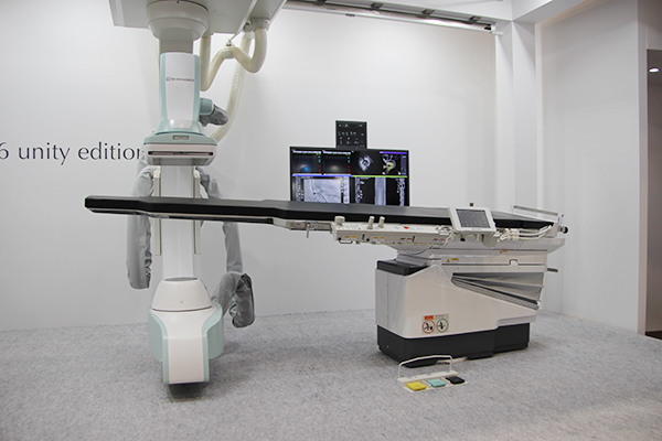 2017年10月に国内販売を開始した血管撮影システムTriniasシリーズunity editionは,新しい画像処理技術やチルト機能を備えたカテーテルテーブルの組み合わせなどにより,高度なインターベンションを強力に支援するシステムである。会場には,下肢撮影など広範囲の撮影にも対応する16インチ×12インチの大視野FPDを搭載した「Trinias C16 unity edition」を,新しいカテーテルテーブルと組み合わせて展示した。