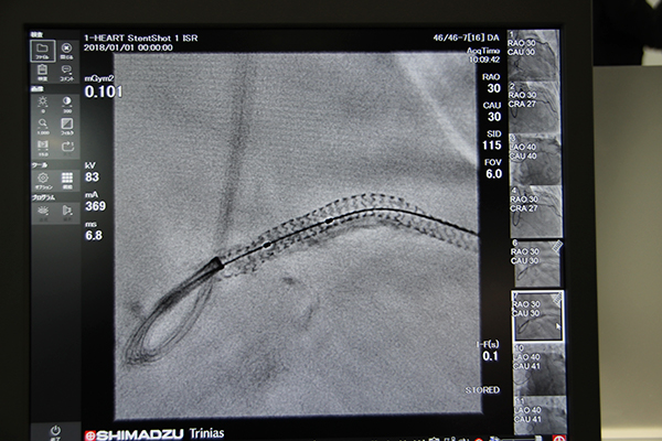 島津は画像処理技術の開発において,“可視化”に重点を置いている。術中にステントの形状やポジショニングをリアルタイムに確認するためのアプリケーションが,“SCORE StentShot”と“SCORE StentView”である。SCORE StentShotは,従来と照射線量を変えずにノイズを約50%低減することができ,拡張したステントの編み目構造も明瞭に視認できる。また,SCORE StentViewは心拍により動くステントを固定・強調表示し,これらにより経験の浅い術者にもわかりやすい画像を提供する。
